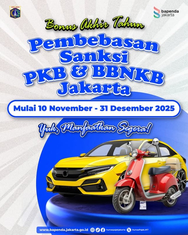 Segera manfaatkan penghapusan sanksi dena Pajak Kendaraan anda untuk Wilayah DKI Jakarta sampai dengan Tanggal 31 Desember 2025